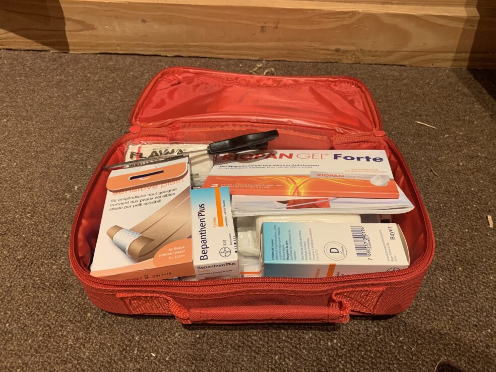 Für Notfälle hat es Verbandsmaterial und Pflaster im Schrank im Wohnzimmer. Im Badezimmer hat es einiges an Medikamenten (Schmerzmittel etc.). Nehmt, was ihr braucht, von Pflaster, Salbe bis Kopfschmerztablette. Meldet usn bitte, falls etwas ausgeht, damit wir Ersatz besorgen können.